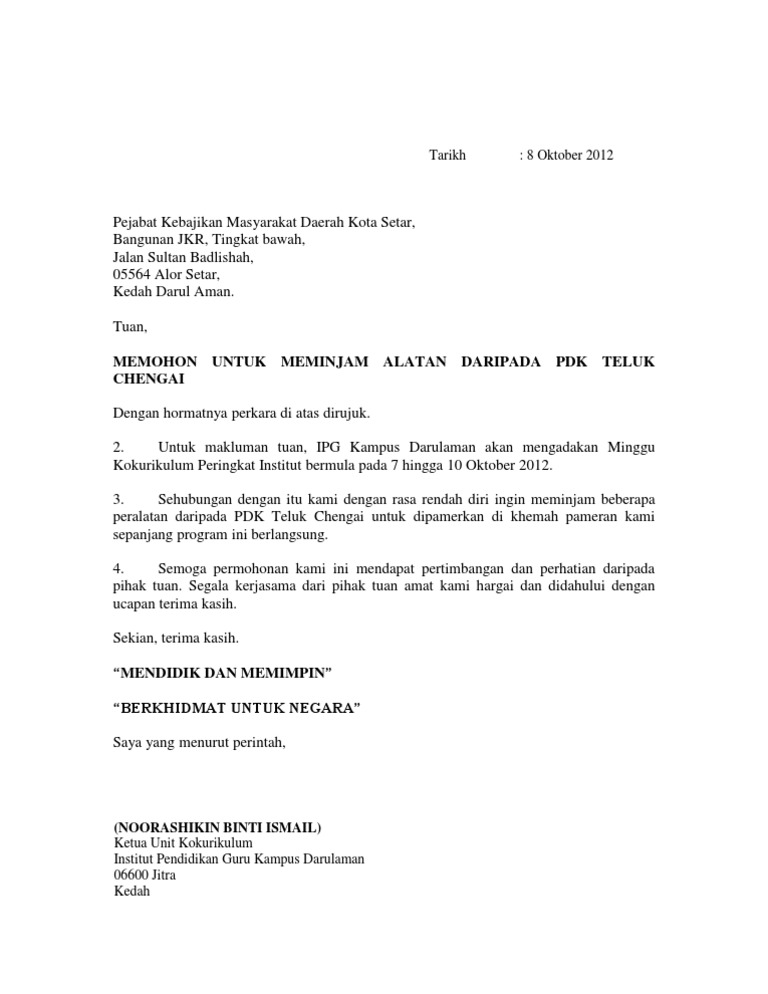 Contoh surat rasmi pinjaman wang lamaran r.